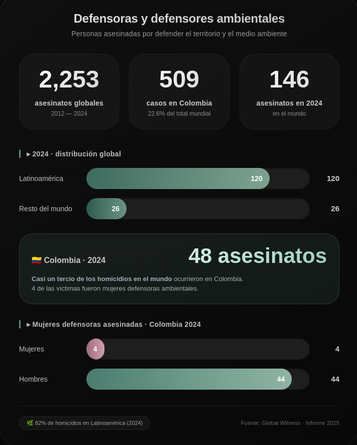 Marlén no se equivoca en su análisis. La organización Global Witness, expone que entre 2012 y 2024 han sido asesinadas 2.253 personas defensoras ambientales en el mundo, e informa que 509 casos ocurrieron en Colombia. La ONG especializada en reportar crímenes a defensores ambientales, también reporta que en 2024 fueron asesinadas 146 personas por defender sus derechos a sus territorios y a un ambiente limpio, sano y sostenible, 120 de ellas en Latinoamérica. Casi un tercio de los homicidios se perpetraron en Colombia, donde a 48 personas les quitaron la vida por defender la vida, 4 de ellas mujeres: